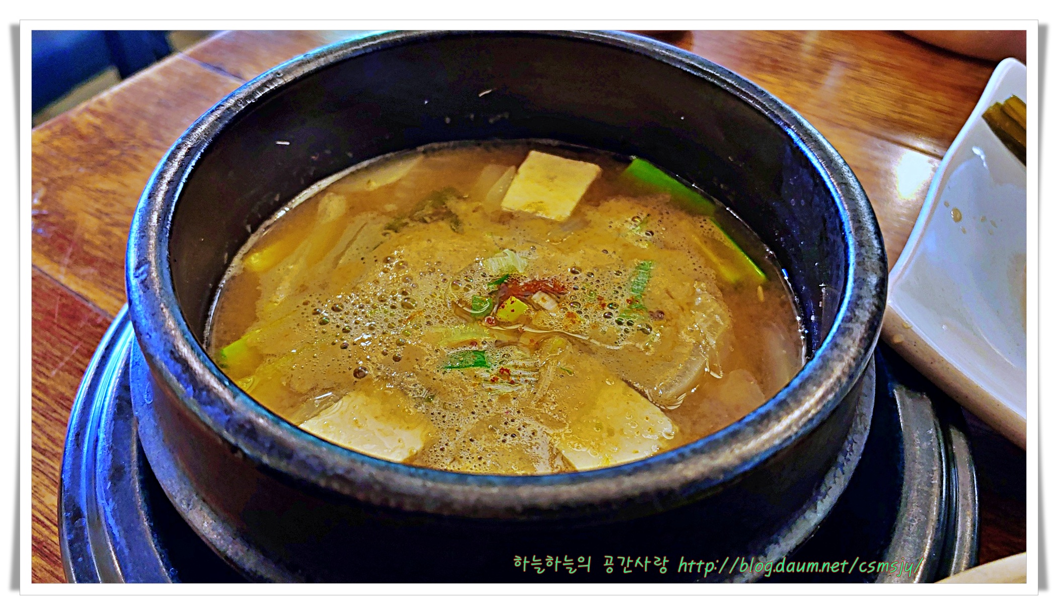 강하지 않은 칼칼함에 구수함을 더하고 부드럽고 도톰한 두부가 들어가 보글보글 끓여 나온 된장찌개는