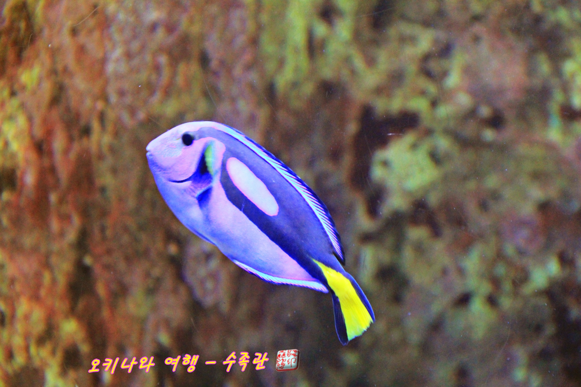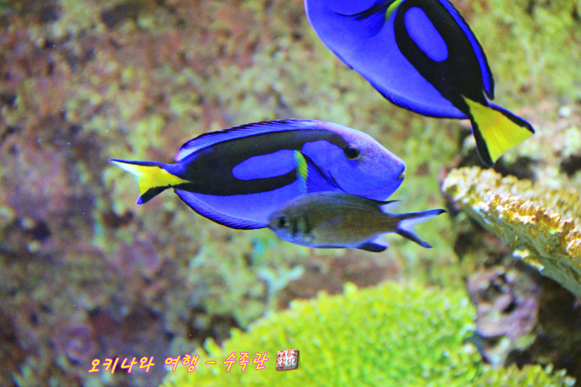 파란 몸통에 검은색 무늬가 있는 이 물고기는 블루탱이랍니다.