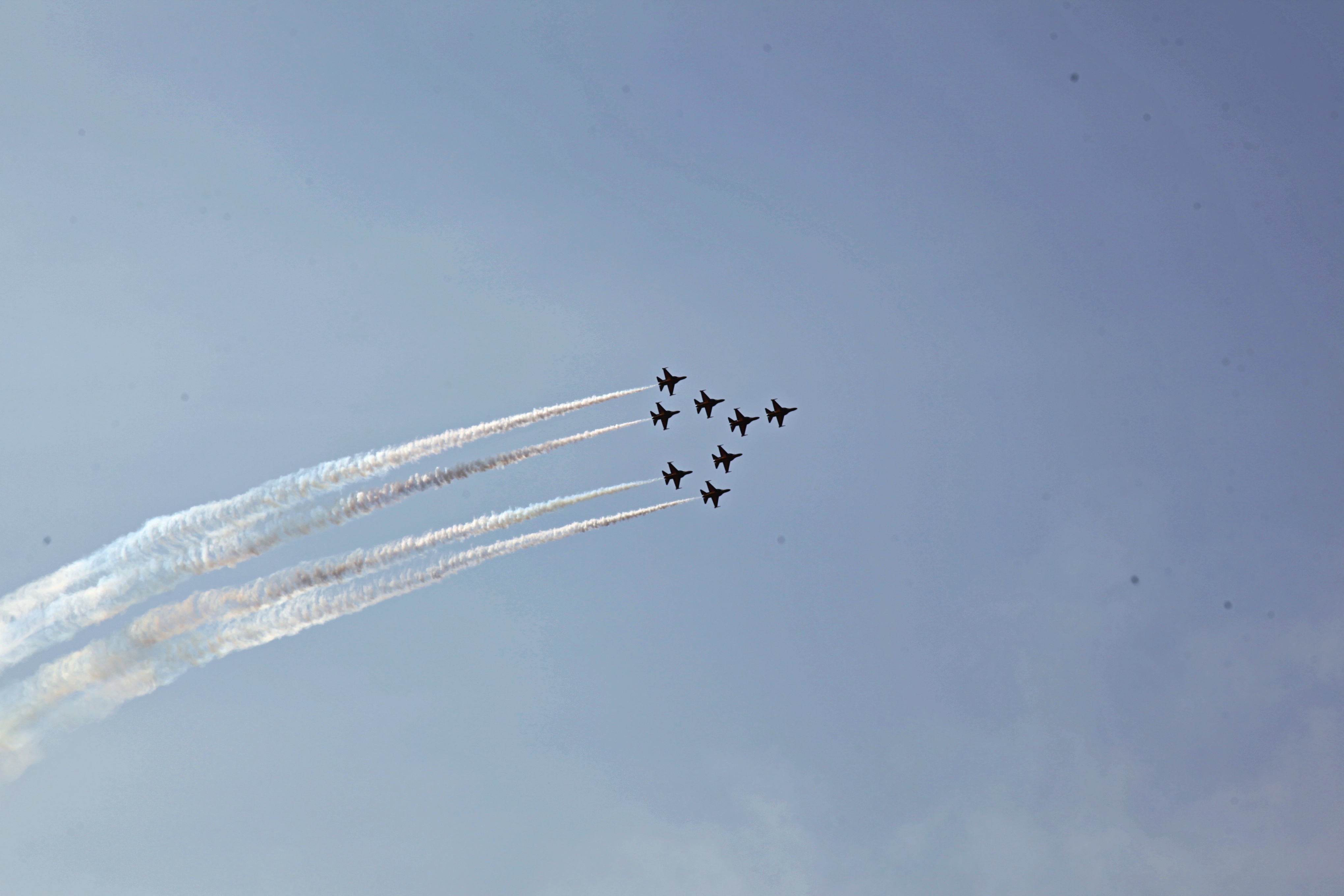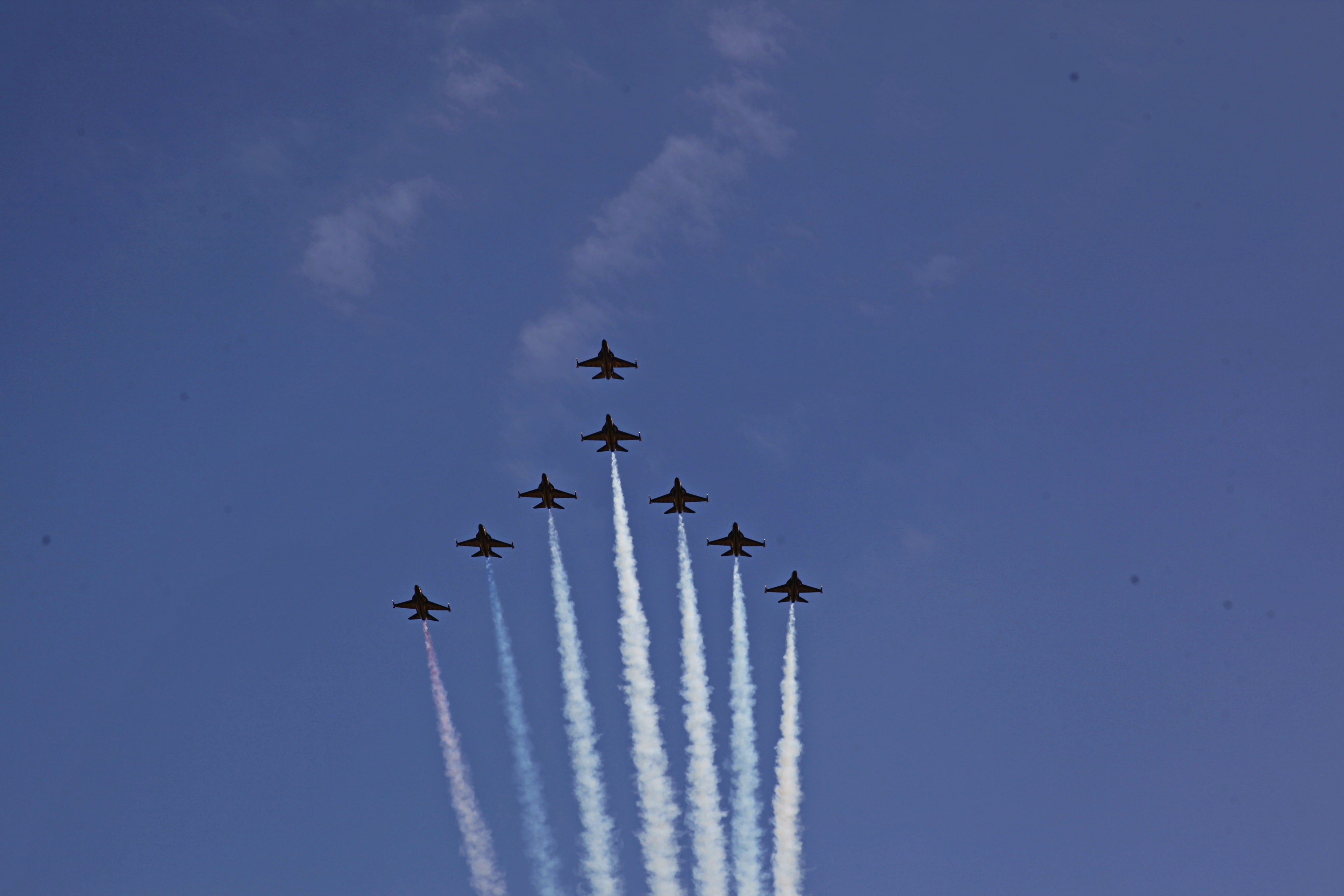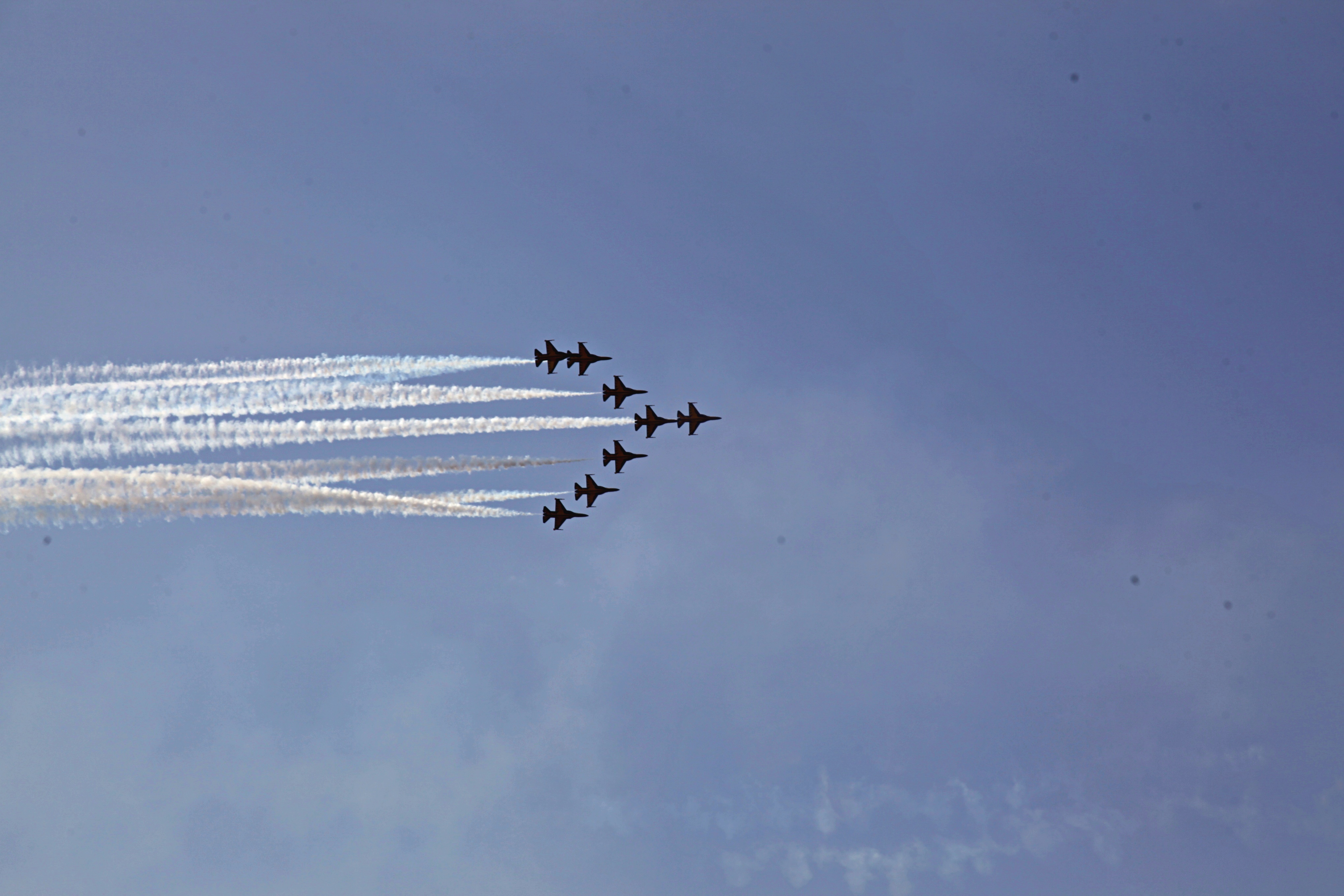 8대의 공군 블랙이글스 항공기 뒤로 연막이 보이고