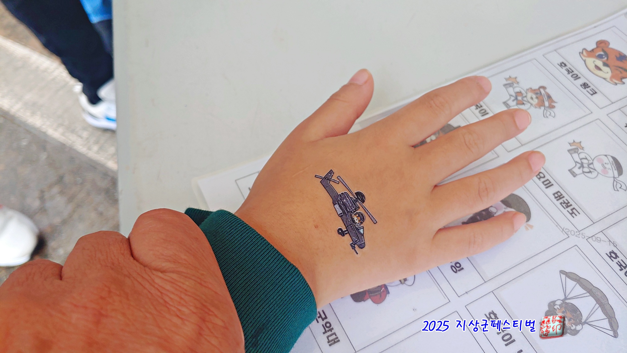어린이 손등에 육군항공의 헬리콥터 헤나가 그려졌습니다.