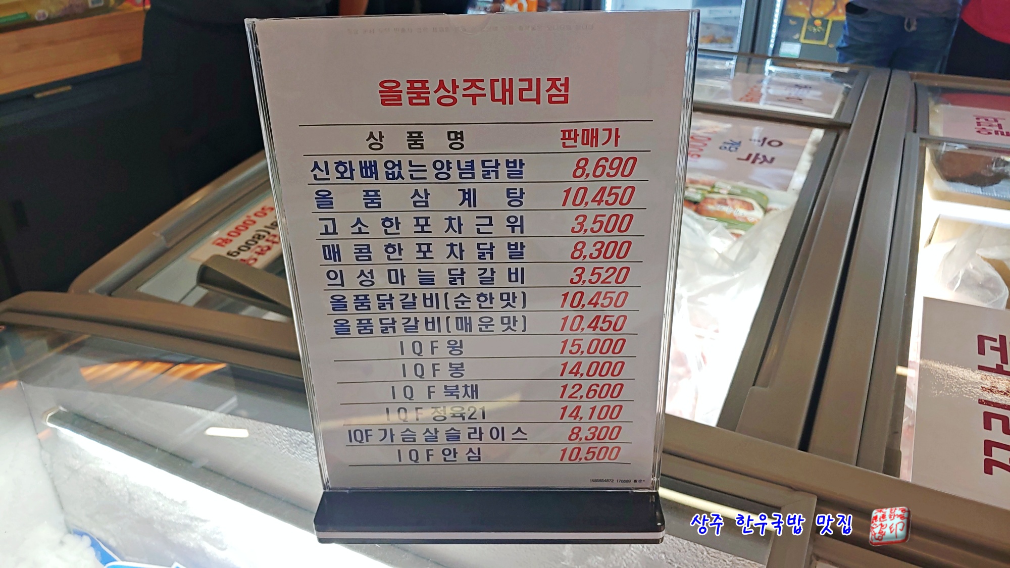 상주 올품 대리점에서 판매하는 닭고기 가격 정보입니다.