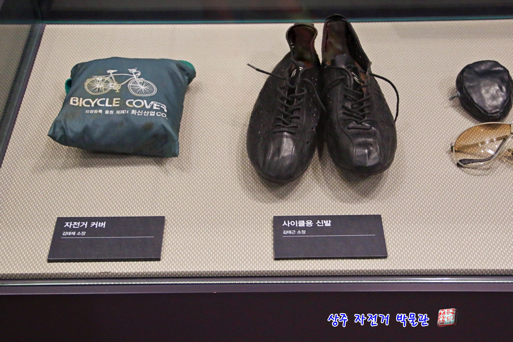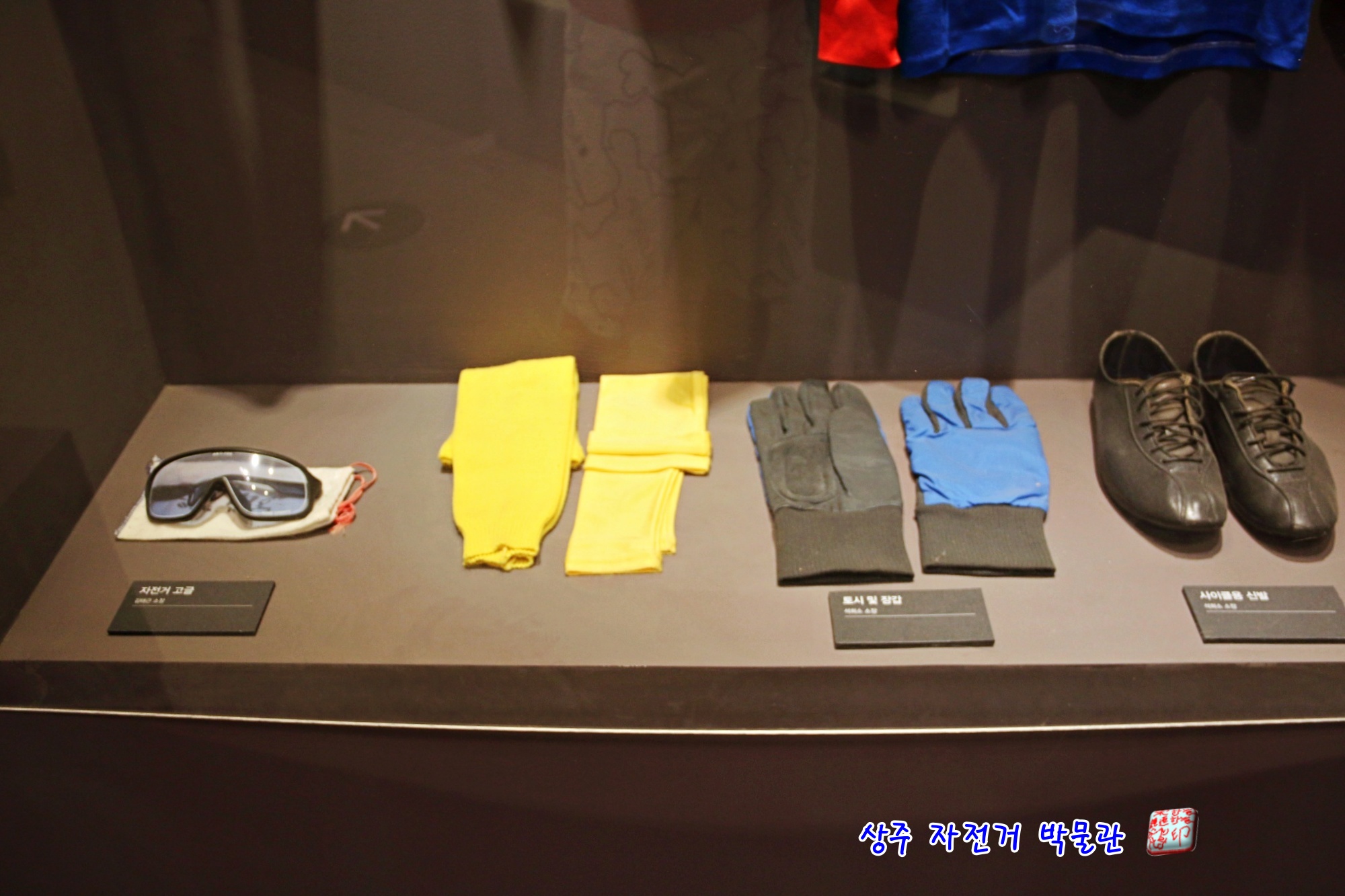 그 외 사이클용 신발과 고글 등 장비들이 전시되어 있습니다.