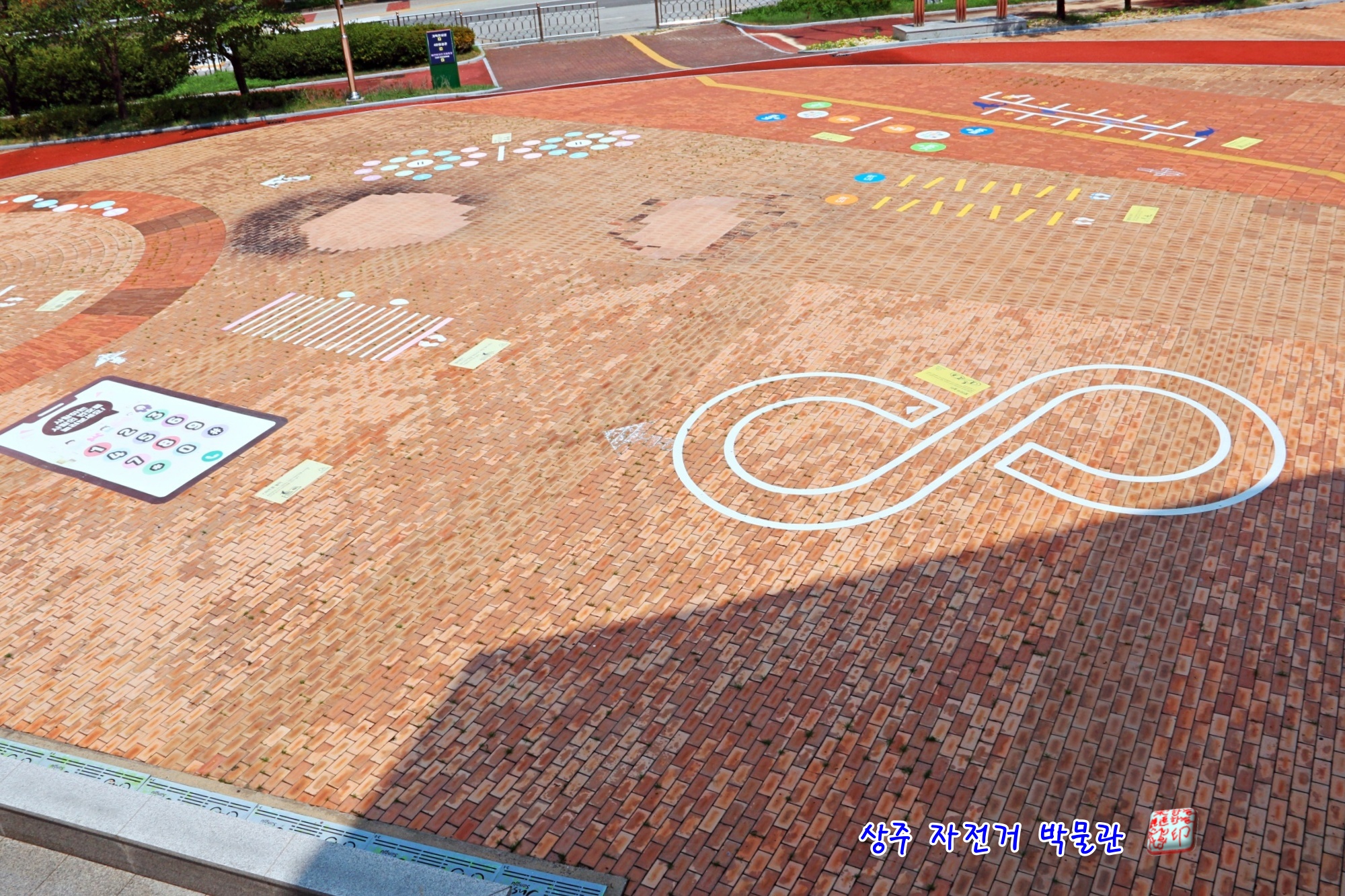 자전거 박물관 입구로 가는 도로에는 두 개의 자전거 바퀴 같은 하얀 그림이]
