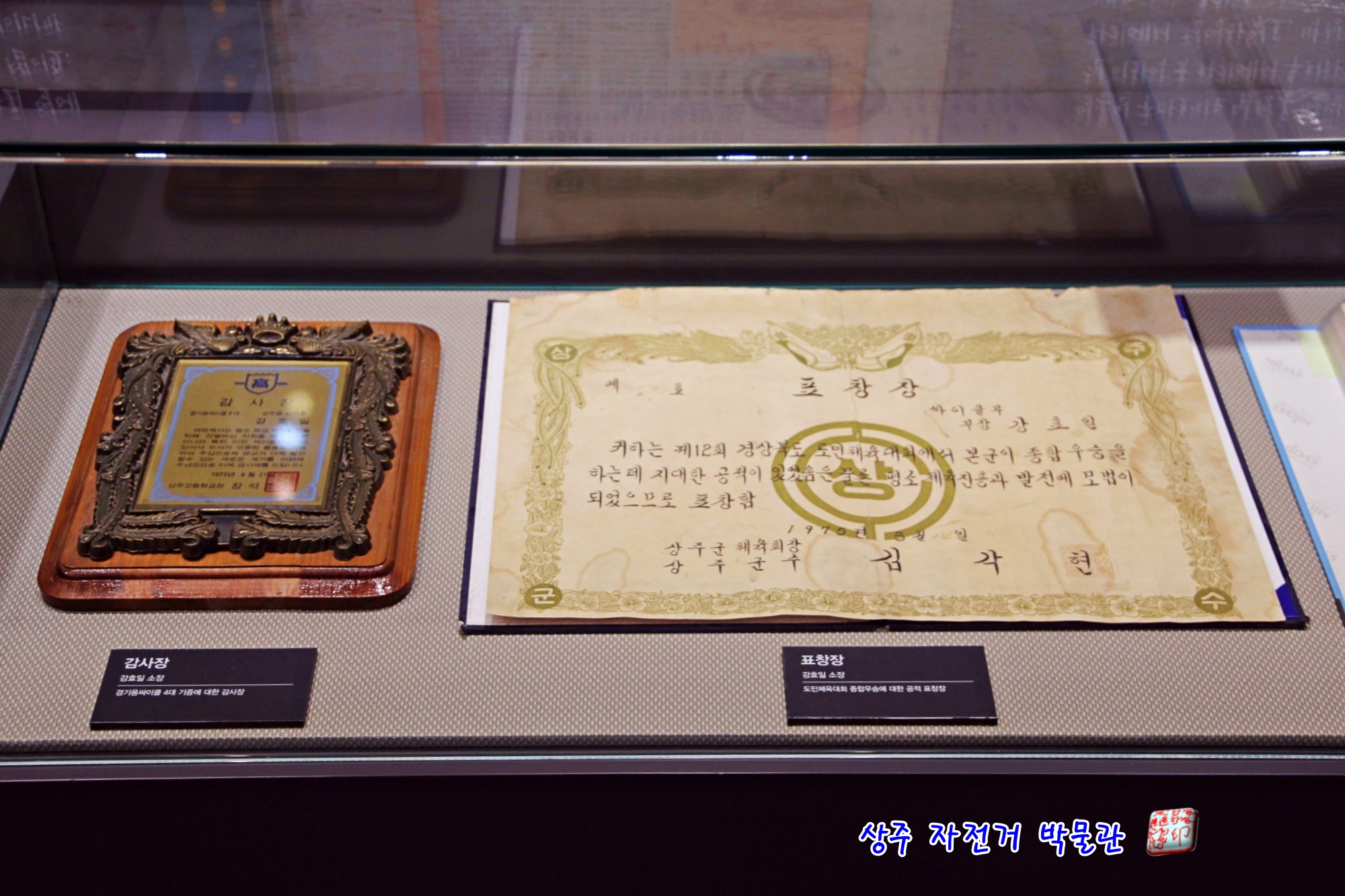 상주군수에게 받은 표창장과 감사장이 전시되어 있습니다.