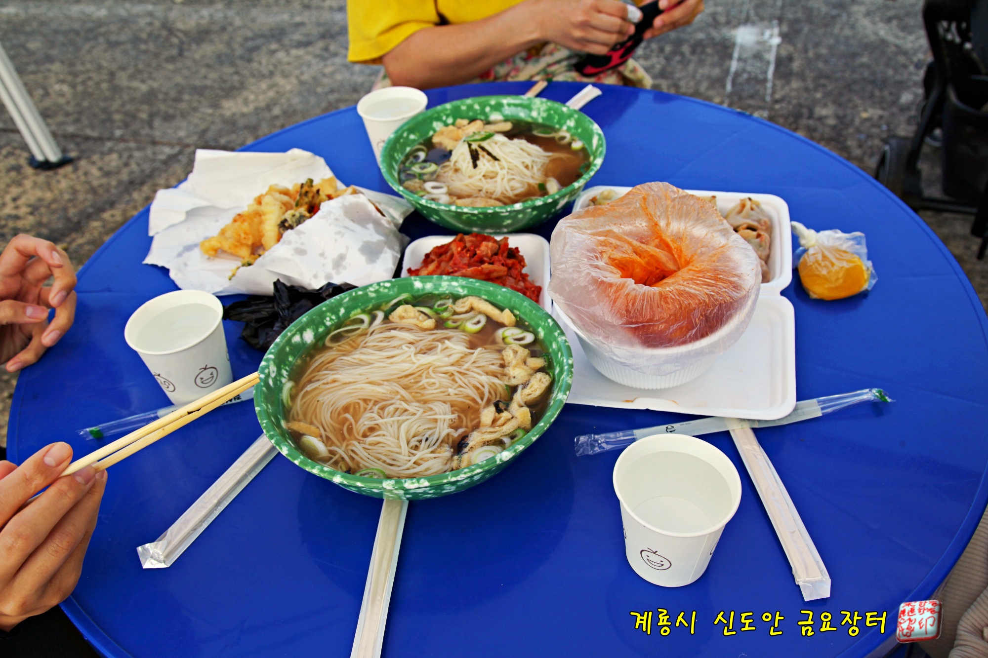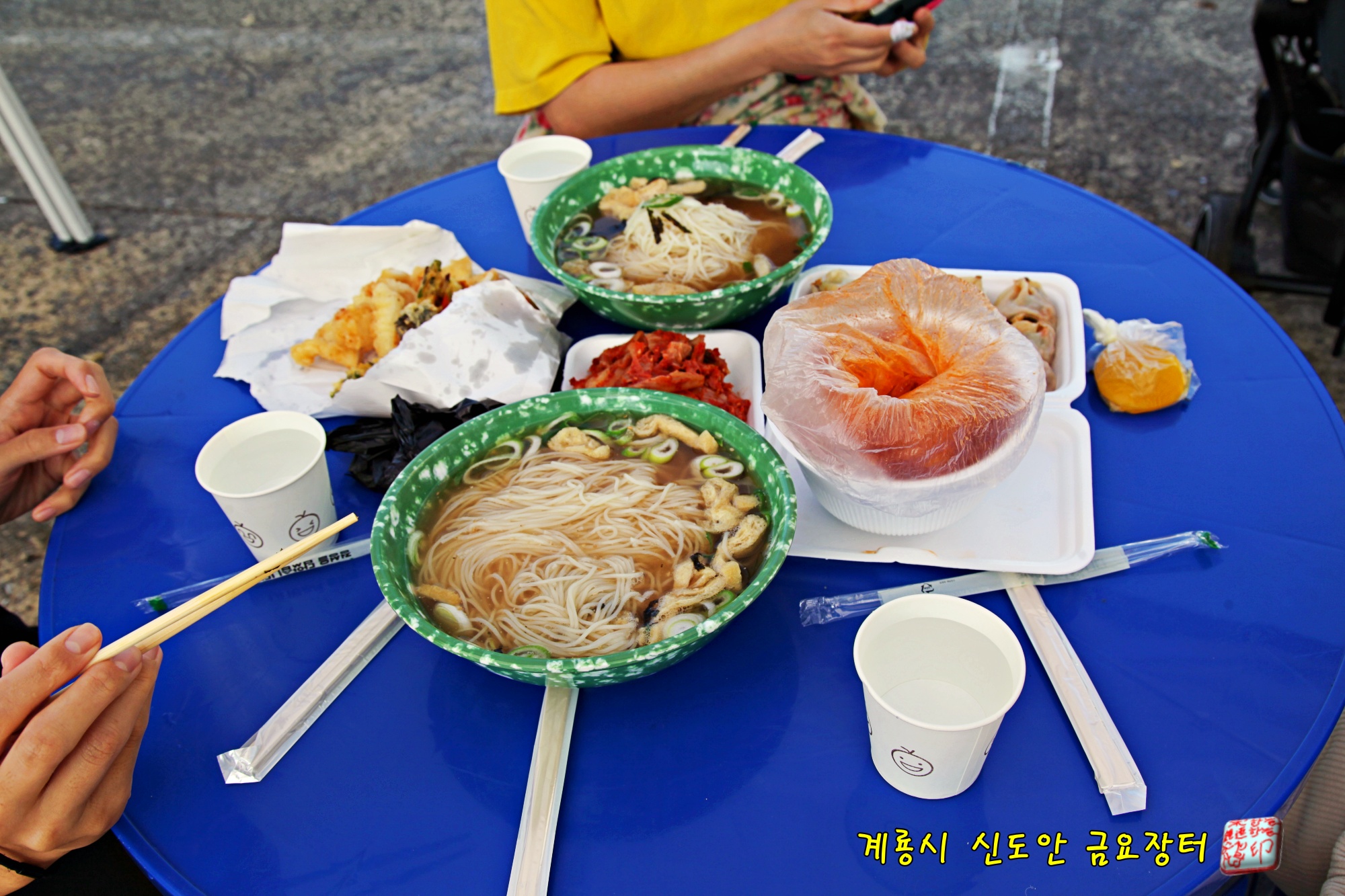 장터에서 판매하는 시원한 국물의 잔치국수와 매콤한 떡볶이,