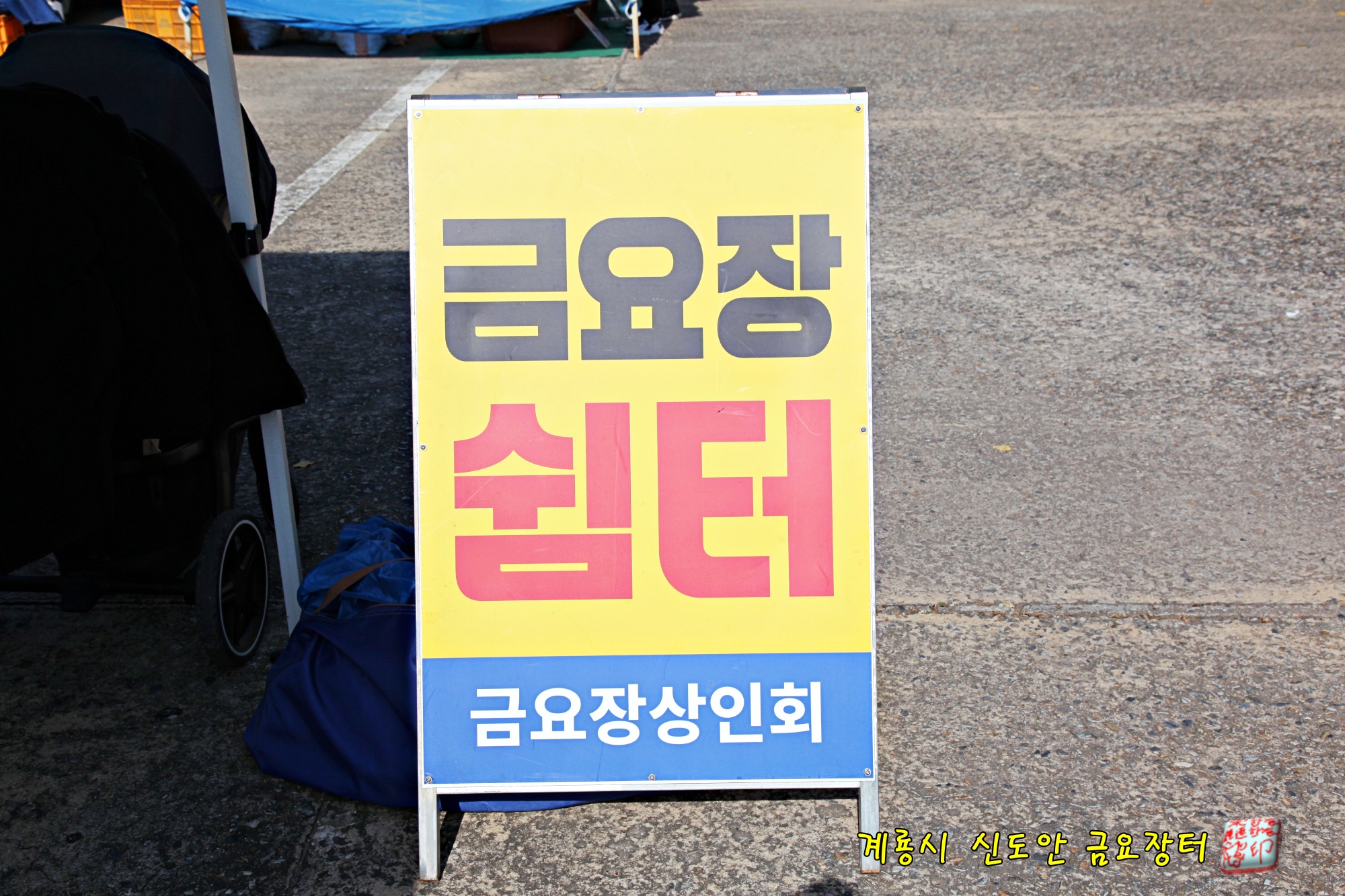 그늘을 만드는 텐트는 금요장터 쉼터라고 안내판이 서 있습니다.