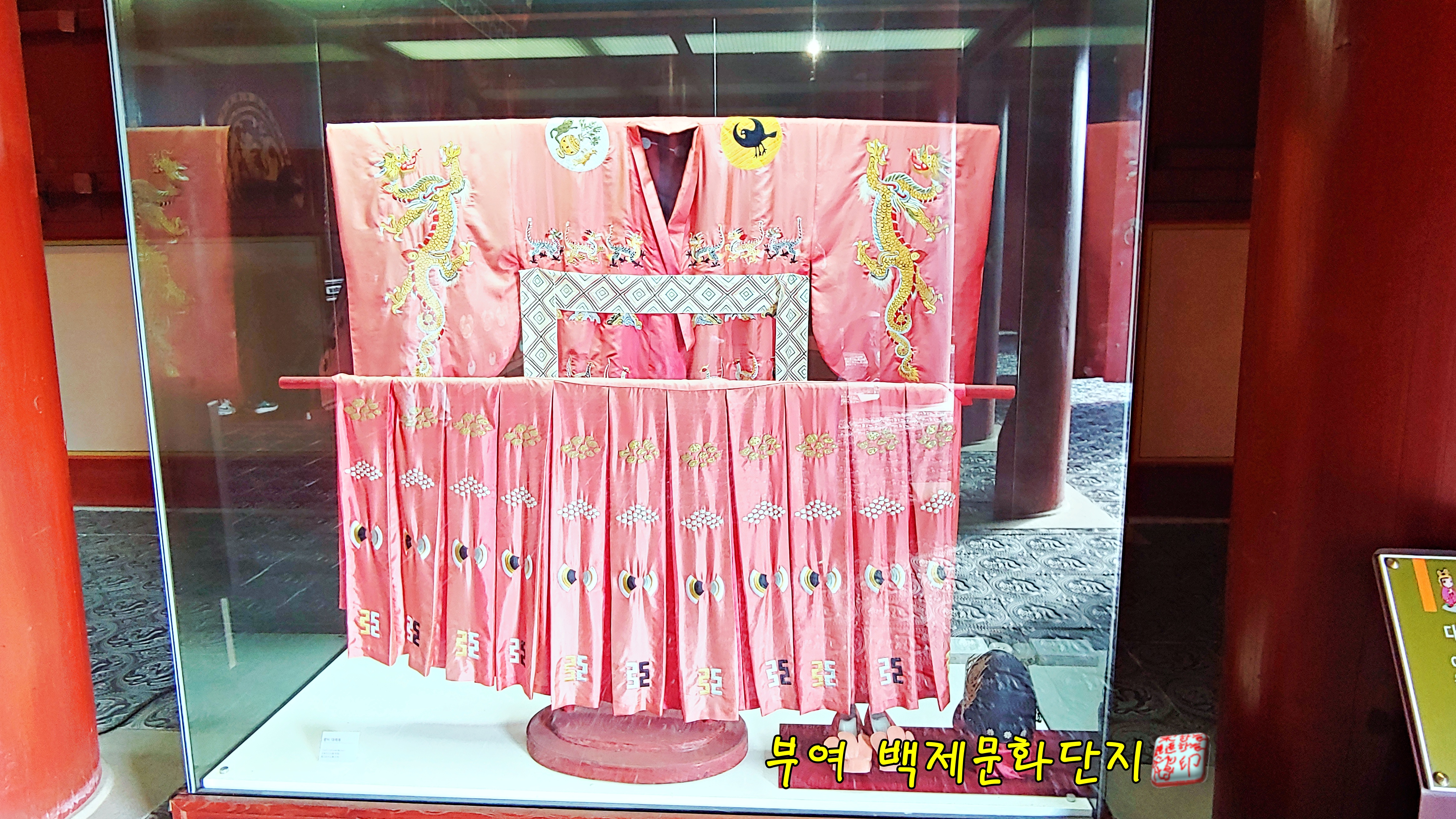 천정전 안에는 백제 왕과 왕비의 평상복과 대례복이 전시되어 있어