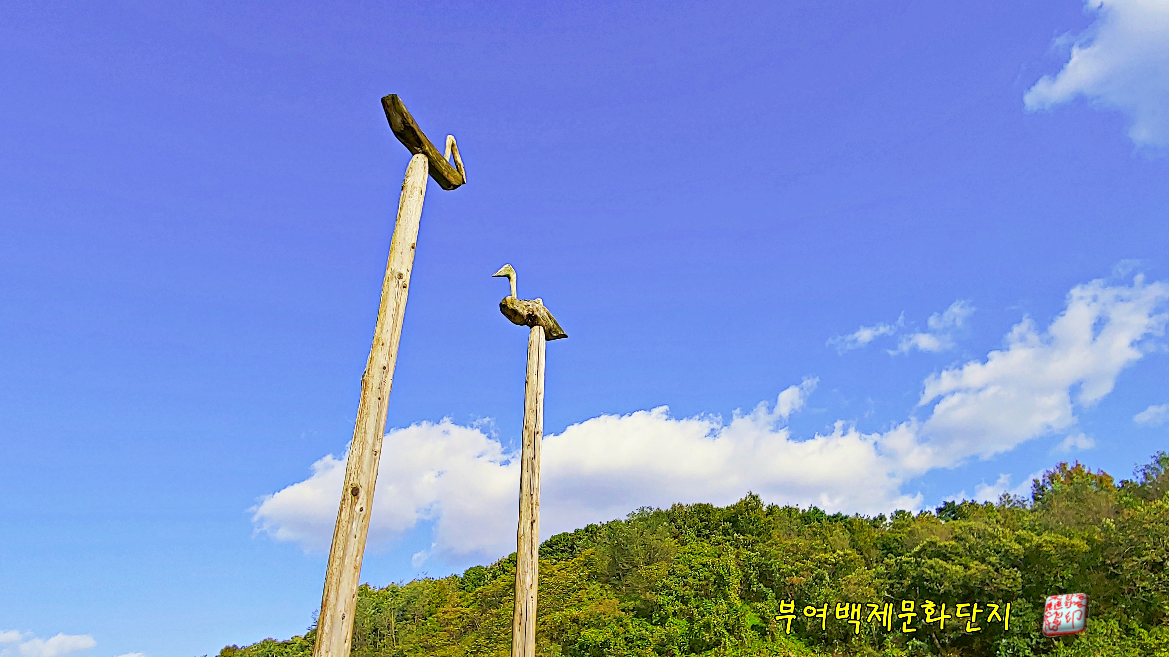 위례성 남문 앞에 있는 기러기 솟대를 가을하늘을 배경으로 담고