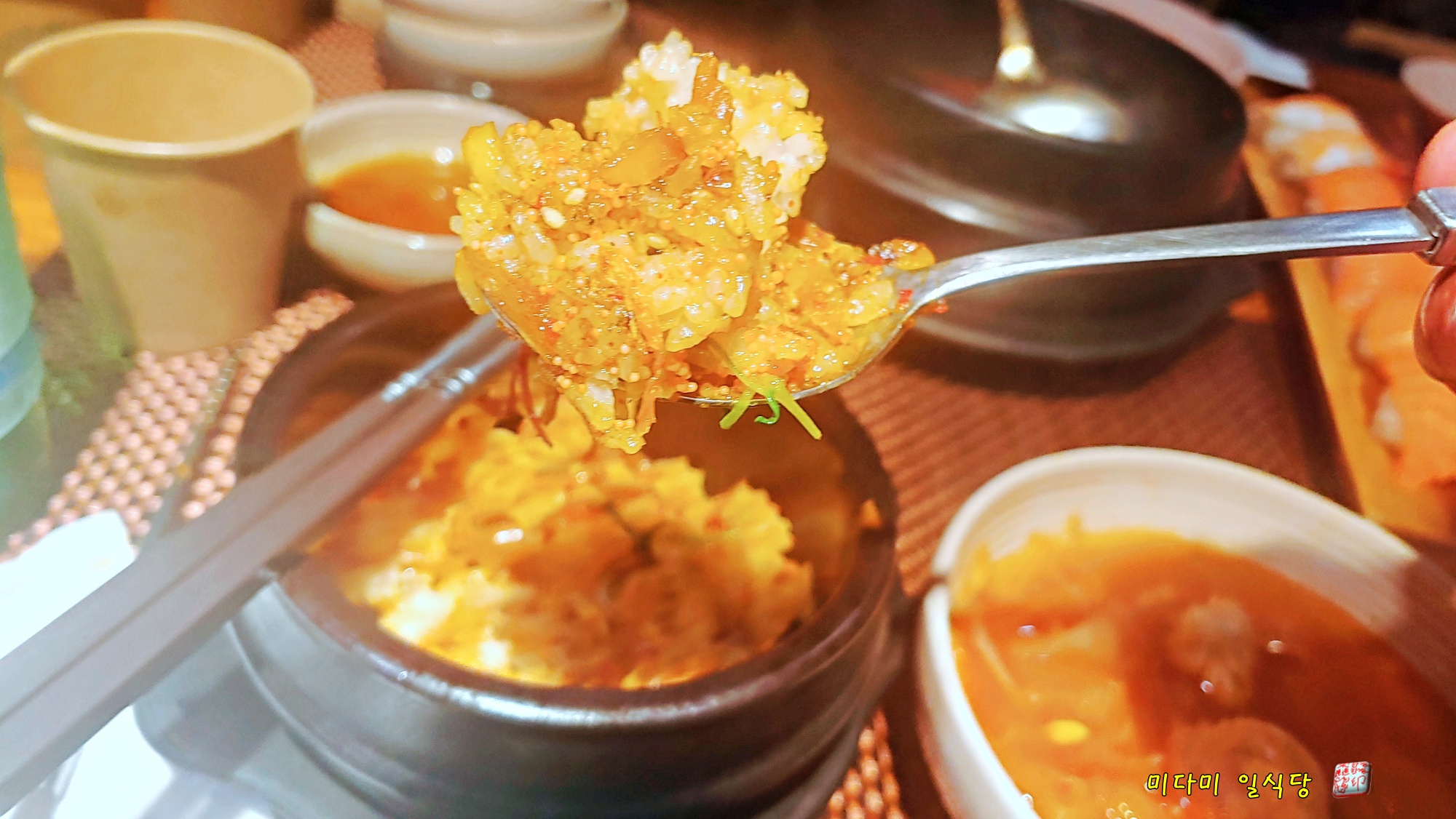 작은 뚝배기 알밥을 뒤집으니