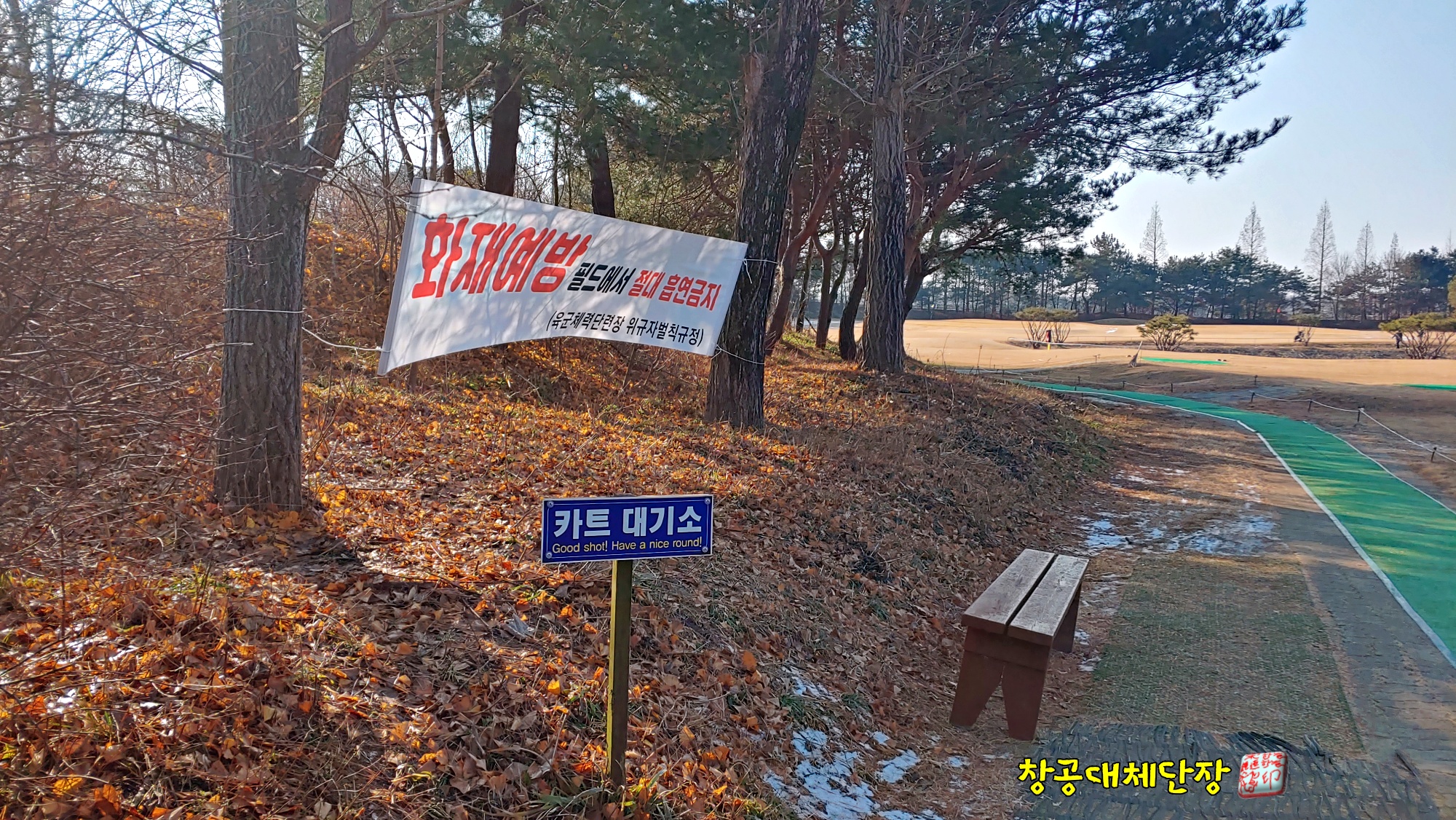 간간히 눈이 보이고 화재예방을 알리는 금연에 관한 플래카드가 걸려 있습니다.