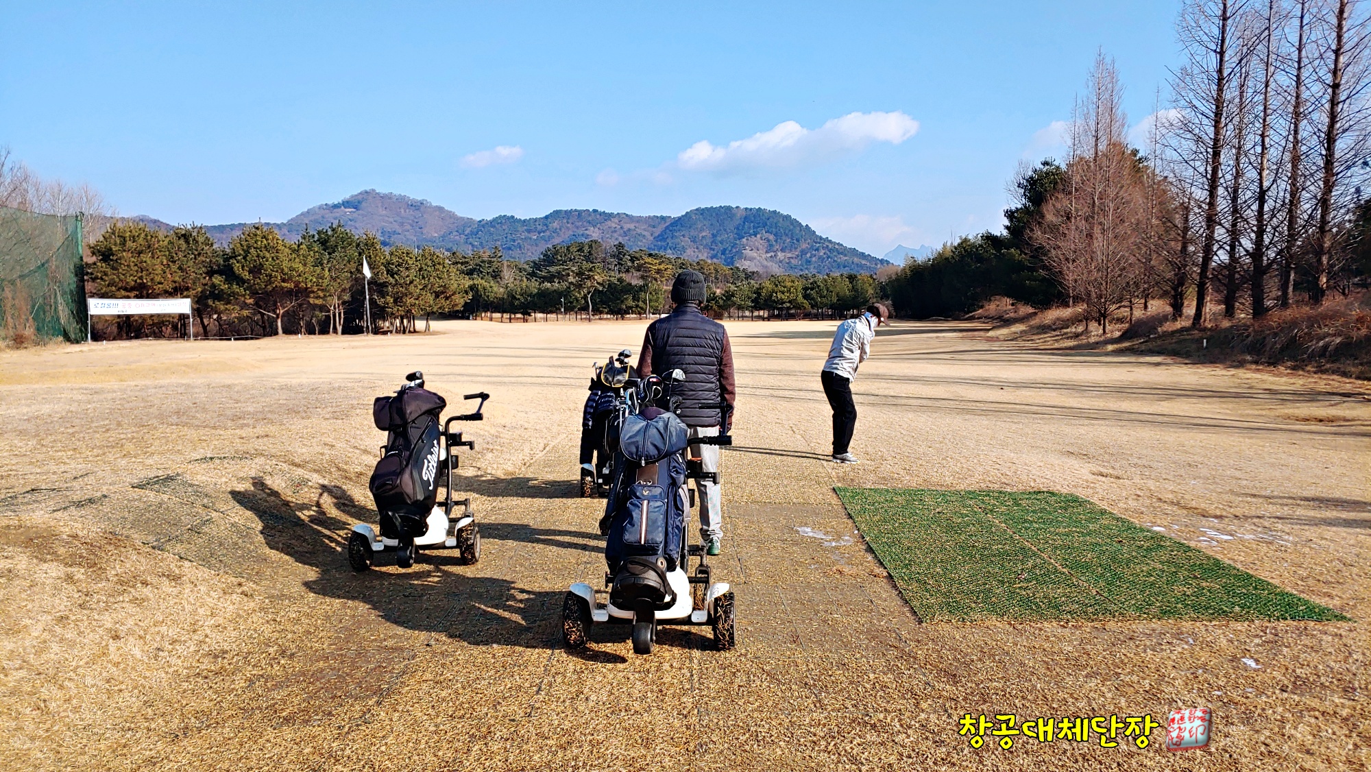 앞 팀이 티샷 후 세컨드 샷을 위해 이동합니다.