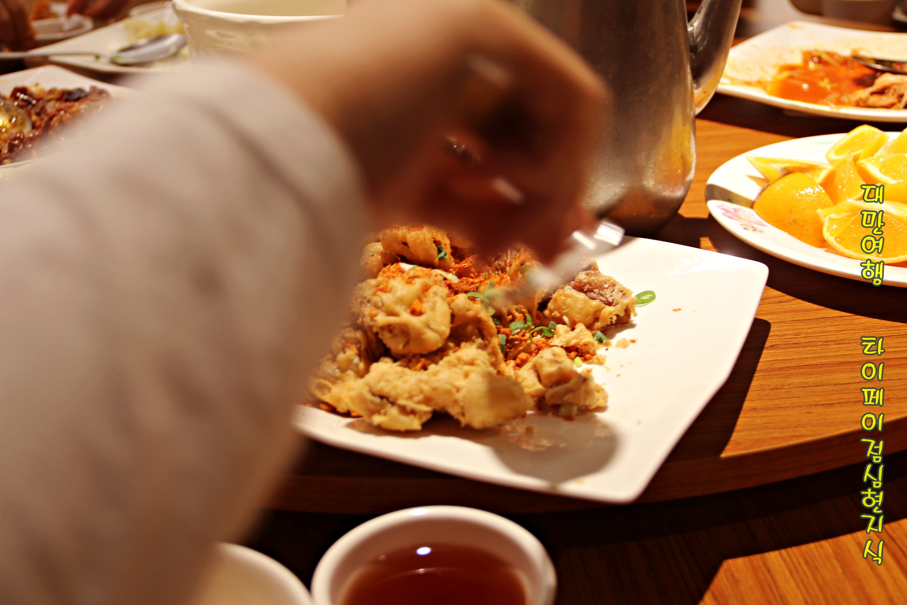 내 접시에 튀김 한 조각 소스에 퐁당해서 담고
